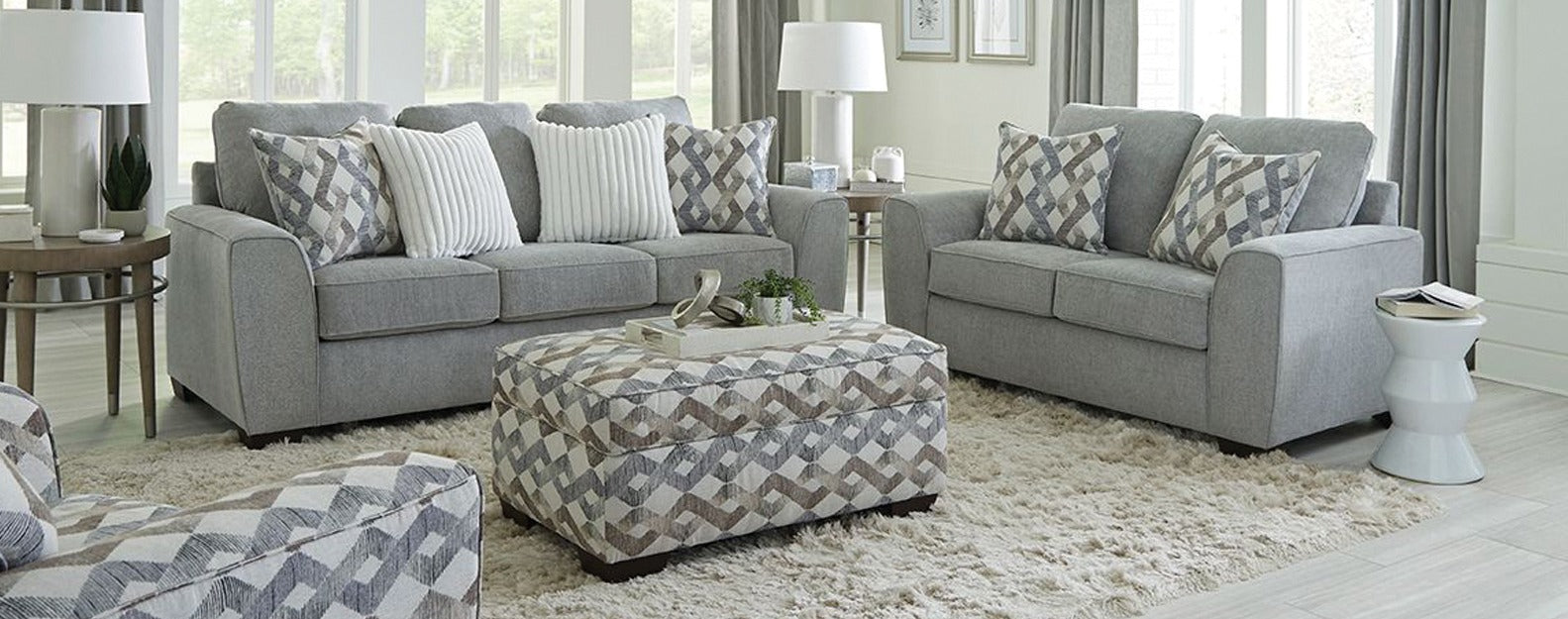 Features modern flared arms and in Steele colored fabric giving any living room a contemporary design. Deep luxurious comfort with 4 accent pillows featuring a plush deep channeled faux fur pillows. Curl up and enjoy ample deep 1.8 density foam seat cushions gives ample comfort for the entire family.