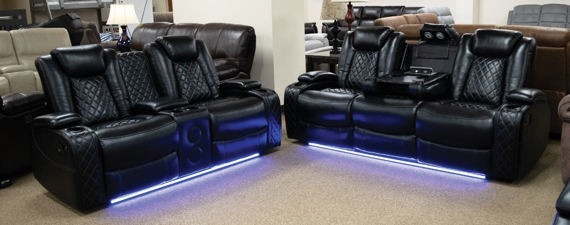 Omega Black features blue tooth speakers, cup holders, storage and charging. This innovative 3-piece sets takes all the technological features you need and wraps them up in a sleek, streamlined top-grain Polyurethane upholstery exterior. This group has extra wide seats taking movie night to a whole new level with this ultimate home theatre experience.