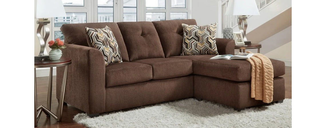 The Galen Chofa features a soft chenille chocolate fabric, slight rolled track arms and extra space in the form of a chaise for relaxing.
