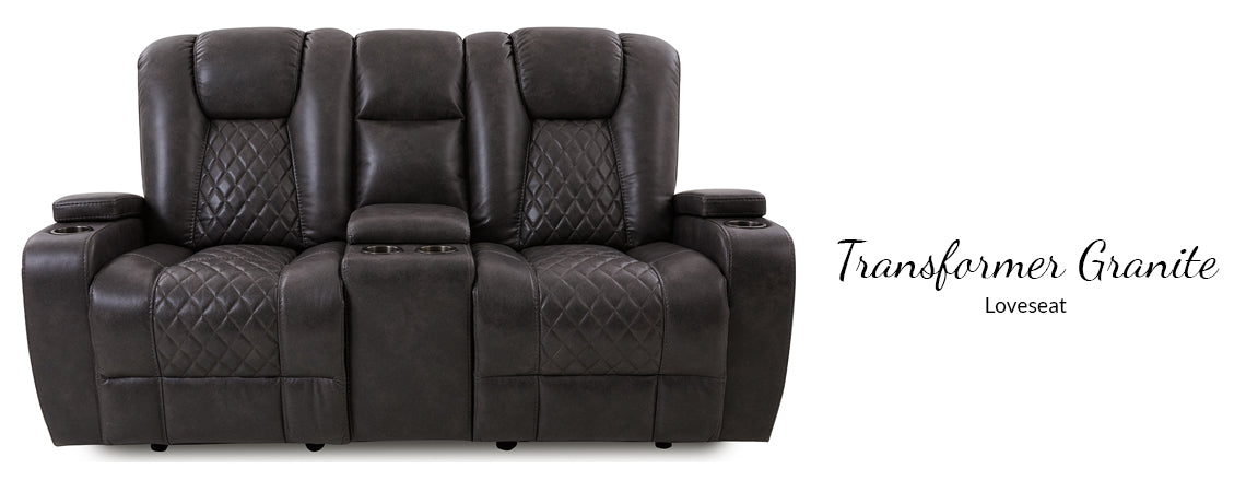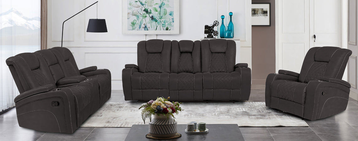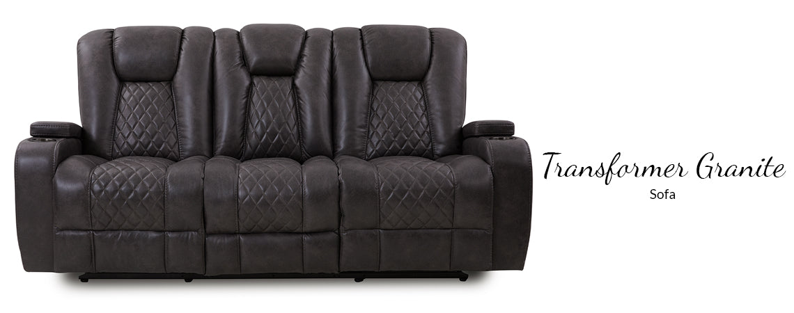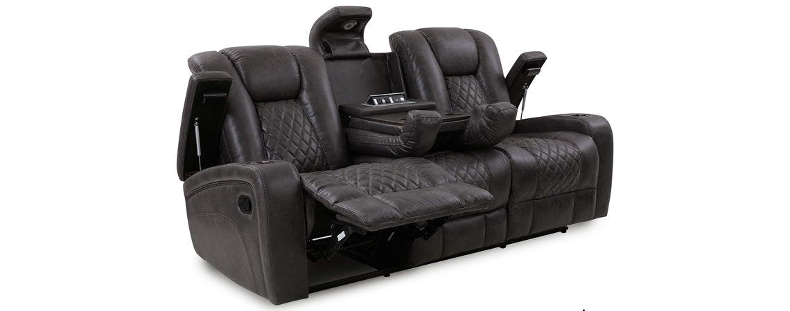 Theater sofa features drop-down table, lights, charging station, dual arm storage cup holders.