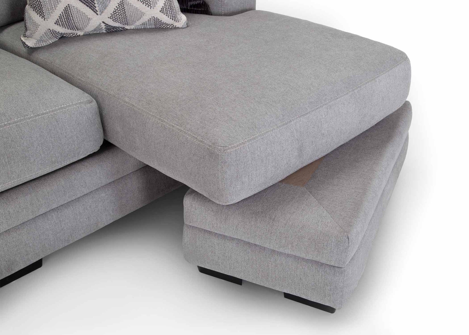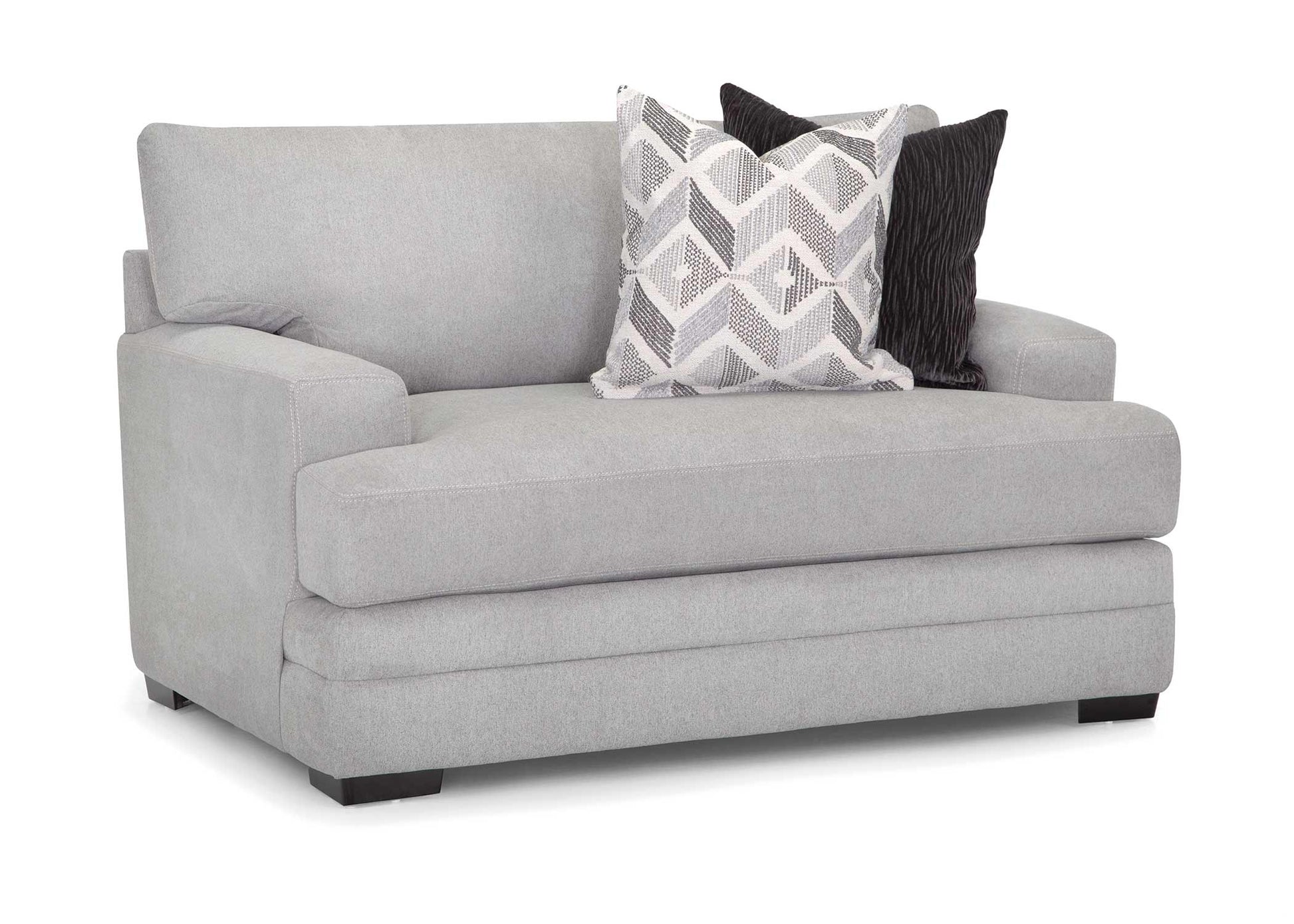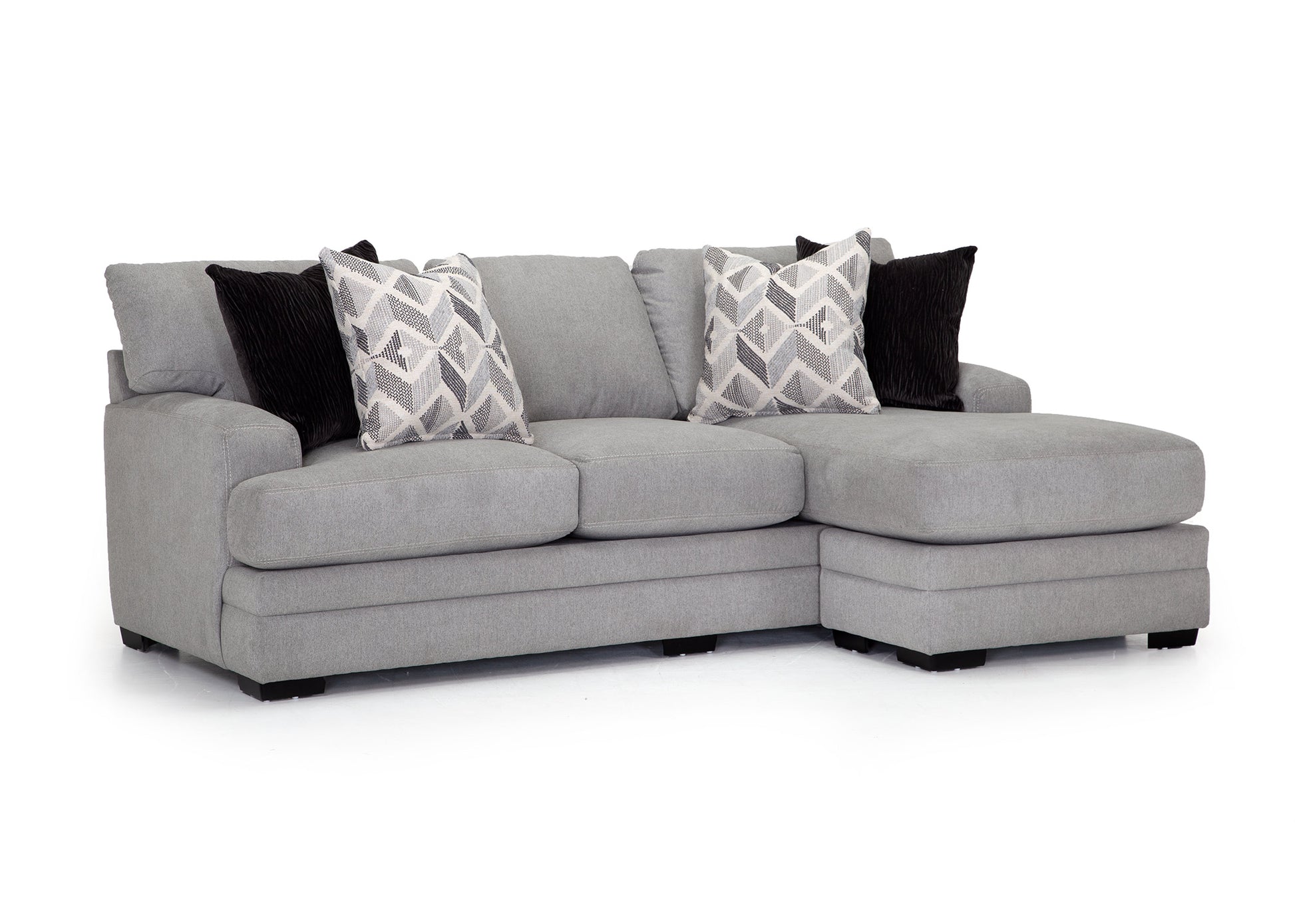 The 960 Cleo Collection combines transitional style with exceptional comfort, making it a perfect fit for modern living spaces. This versatile group includes a sofa with a reversible chaise, a chair and a half, and a matching ottoman, offering a range of seating options to suit your needs. Upholstered in a soft light gray fabric, the Cleo provides a neutral yet stylish foundation that complements any décor. Coordinating throw pillows with pops of light and dark gray add depth and visual interest, giving the set a polished, designer-inspired look.