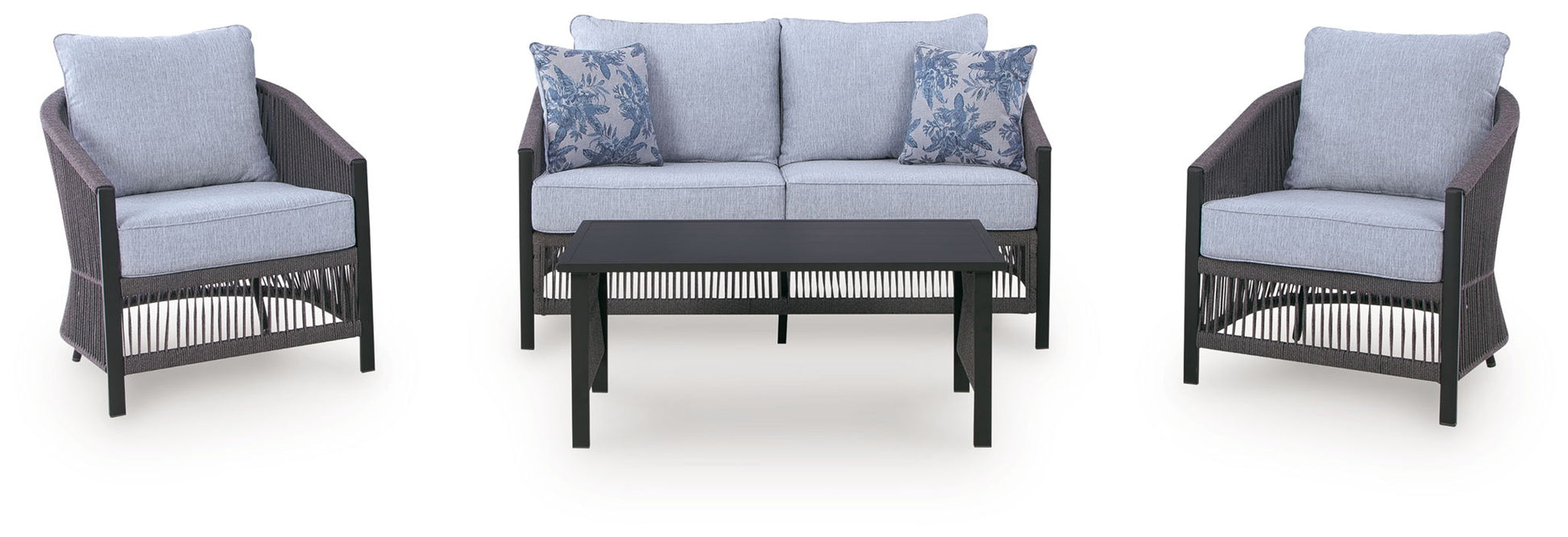 - Includes loveseat, 2 lounge chairs and coffee table