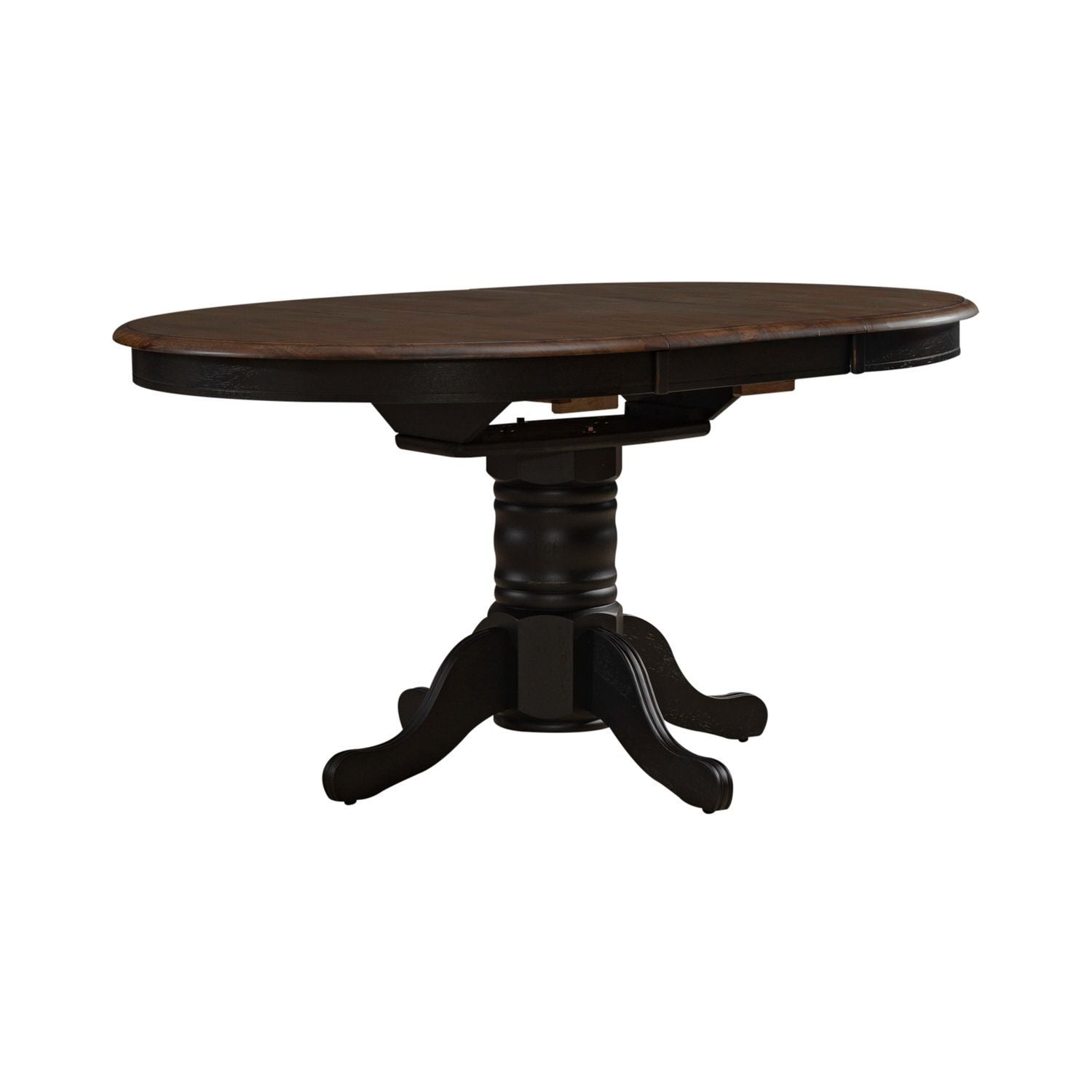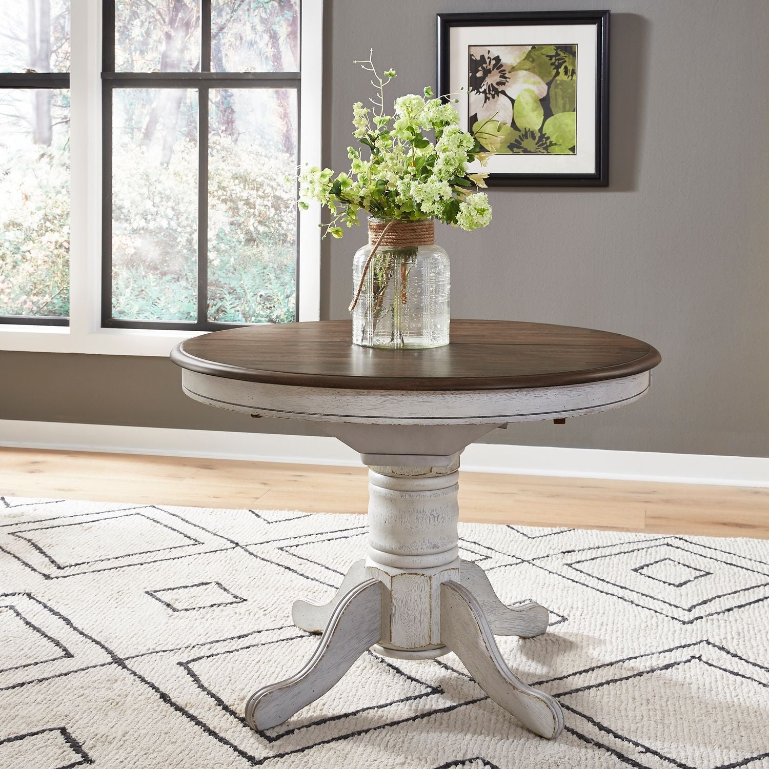 This Carolina Crossing Pedestal Table is distressed, yet current. Consisting of an antique finish with heavy distressing, this table design translates well into any space. This is a smaller pedestal table, making it perfect for limited space, but could also be used in a larger space, as there is a 15" butterfly leaf included.