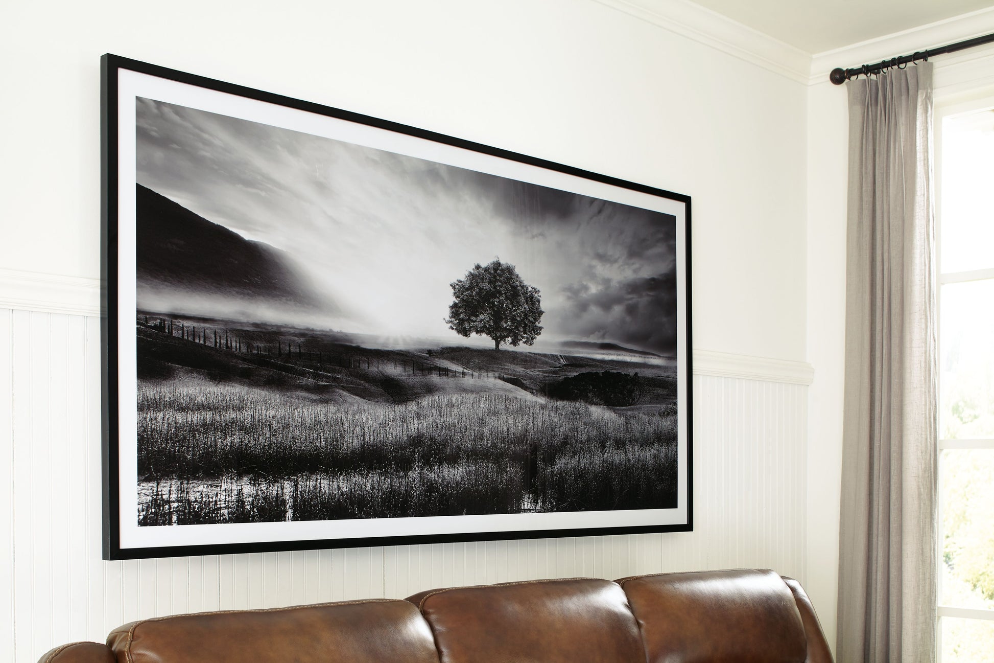 Filled with calming natural elements, this wall art has a refined look with a restful feel. It captures a landscape with rolling hills, drawing your eye to the tree standing tall in the center of the creation. Lighter tones in the clouds bring brightness to the black and white design, making for a striking addition to your modern decor.