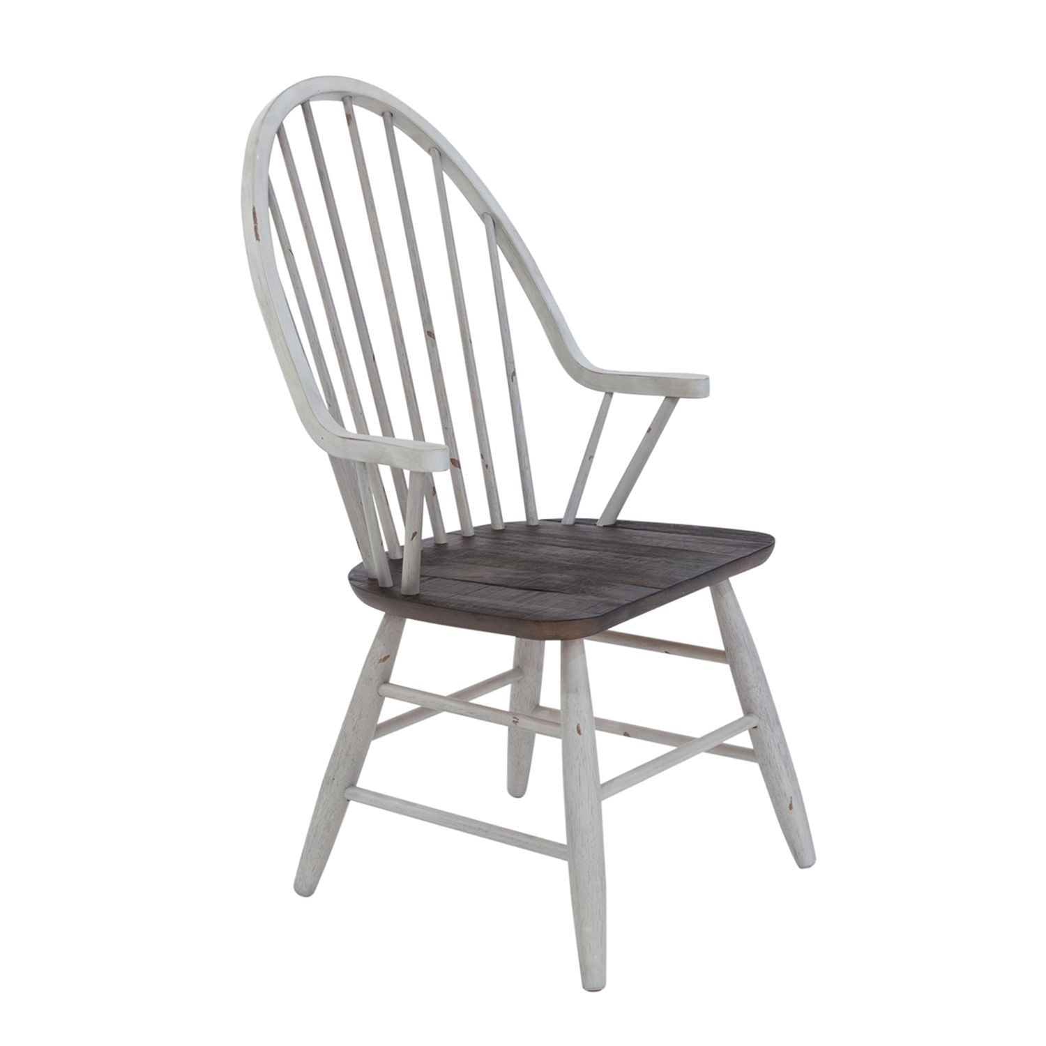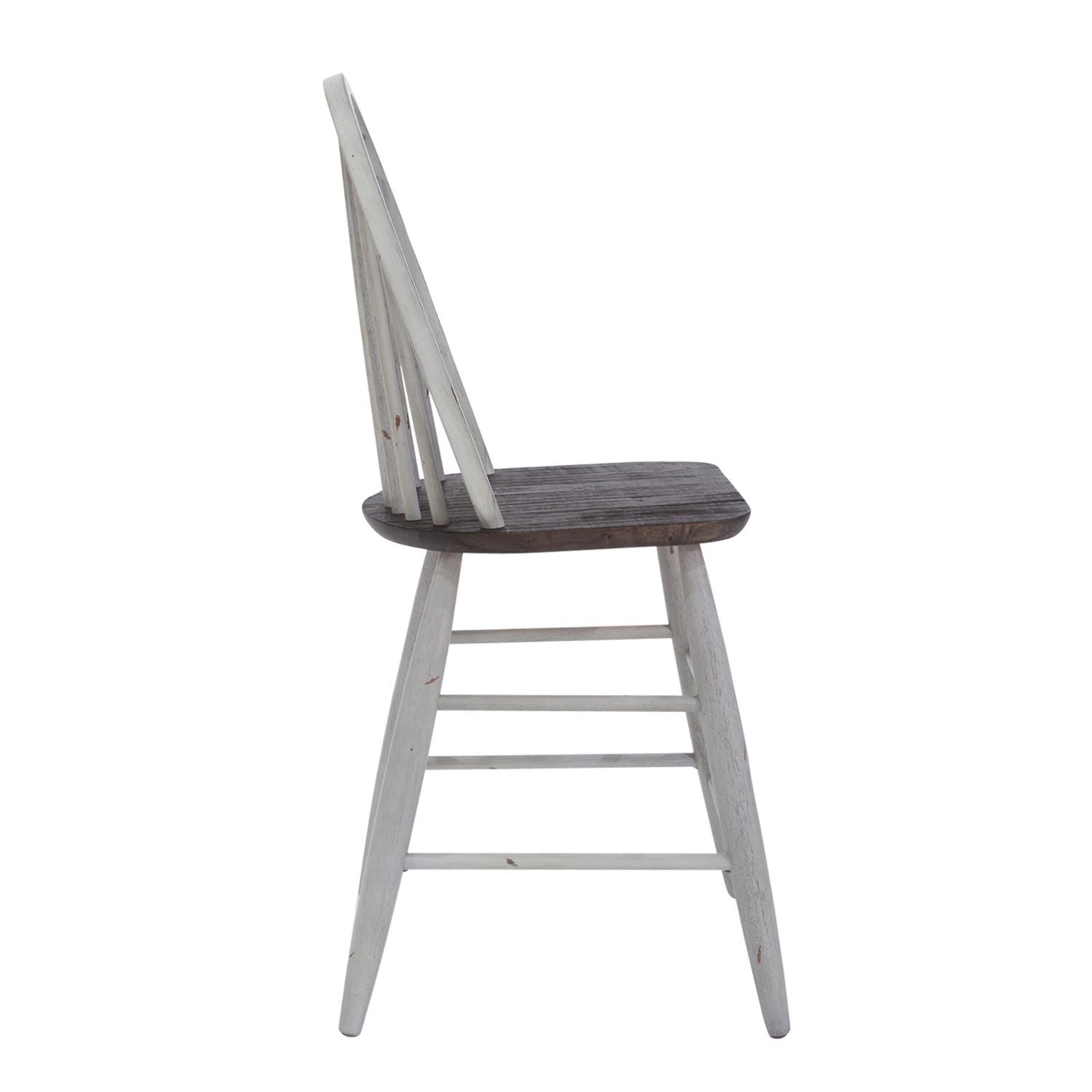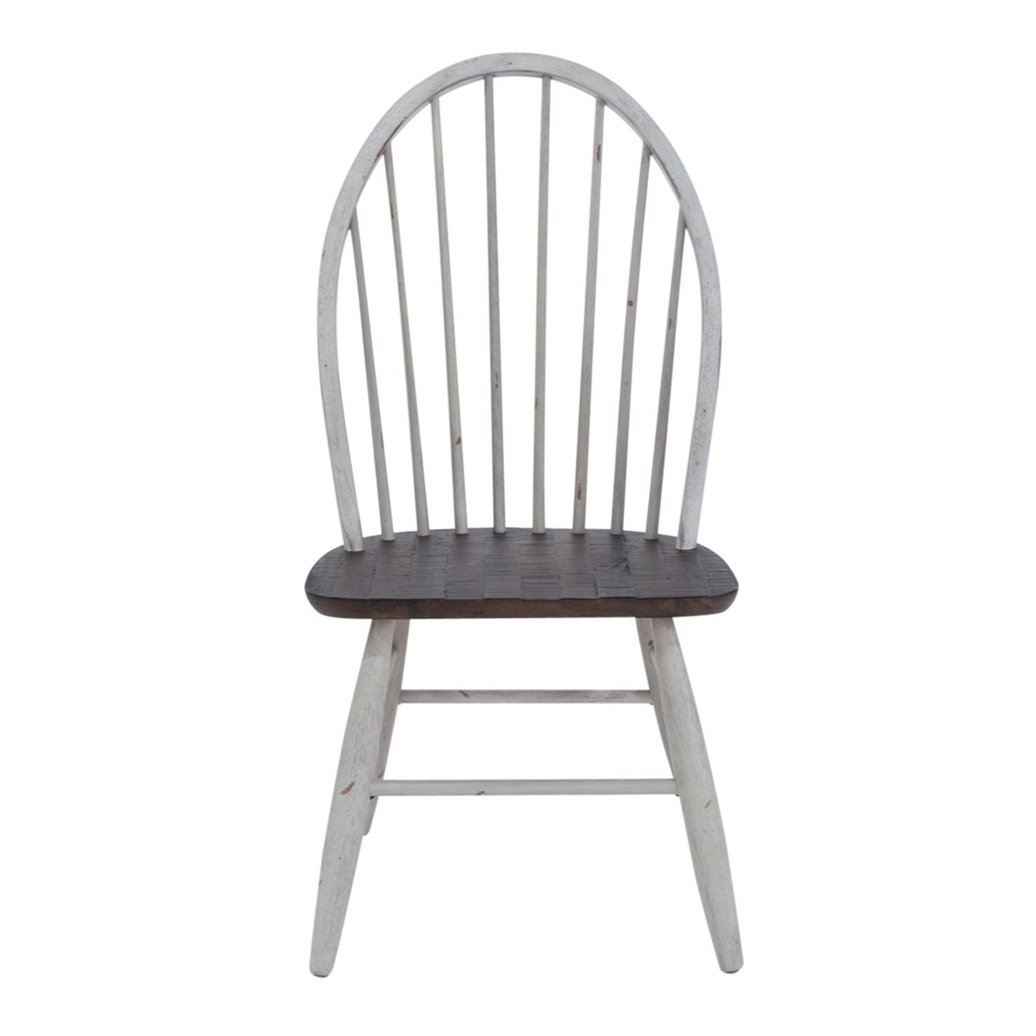 Sit in style and comfort with the Farmhouse Windsor back chair. Crafted of rubberwood solids, this piece features a timeless heavy distressing and nylon chair glides to protect your flooring, a saddle shaped seat for extra comfort, an arched spindle back for support, and is anchored by round turned splayed legs. The two-tone finish with wood tone seat creates a versatile look that is sure to be the perfect addition to any space.