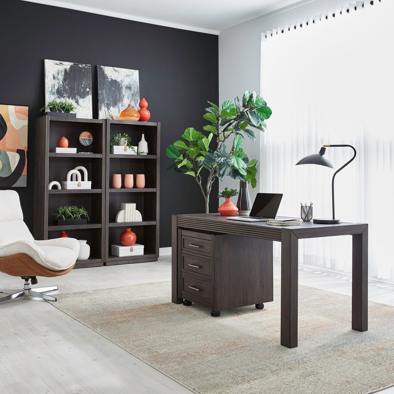- Includes the Writing Desk, Castered File Cabinet & 2 Bunching Bookcases