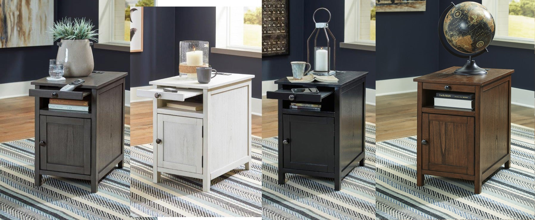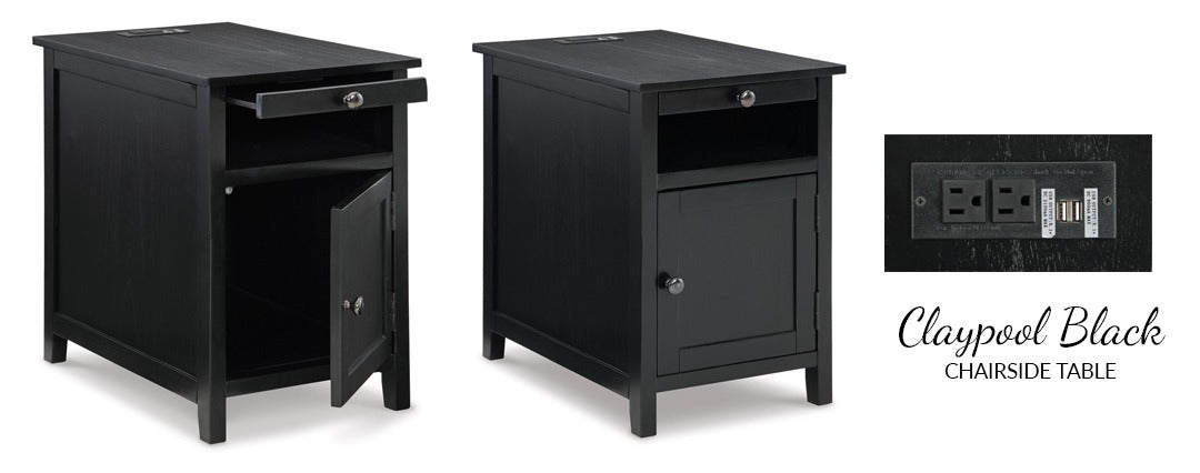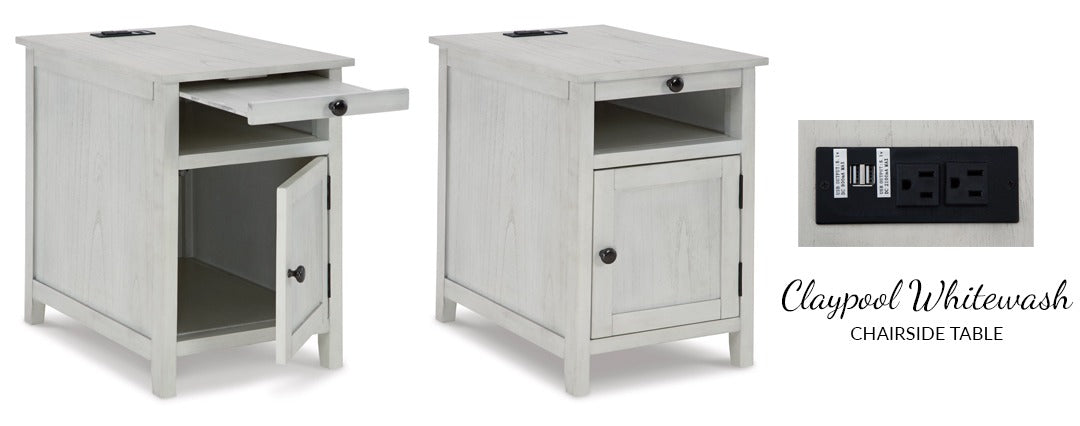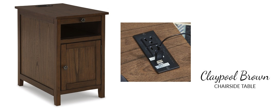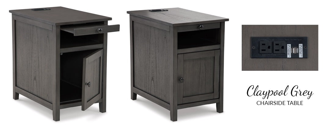 Add big character to a small space with the Claypool chairside end table. With its compact size and strong silhouette, it can go anywhere and blend easily into the decor. Less is so much more with the Shaker-inspired design and teal wood tone finish. Loaded with form and function, this end table displays accent pieces and stores essentials securely while keeping devices powered up.